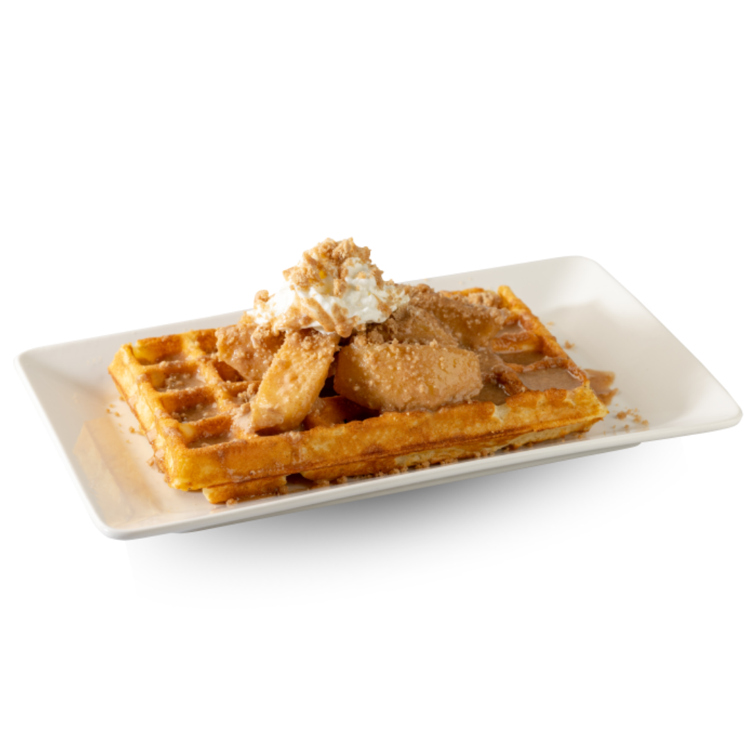 Our original golden-brown waffle loaded with homemade apple, cinnamon crumble, topped with whipped cream.