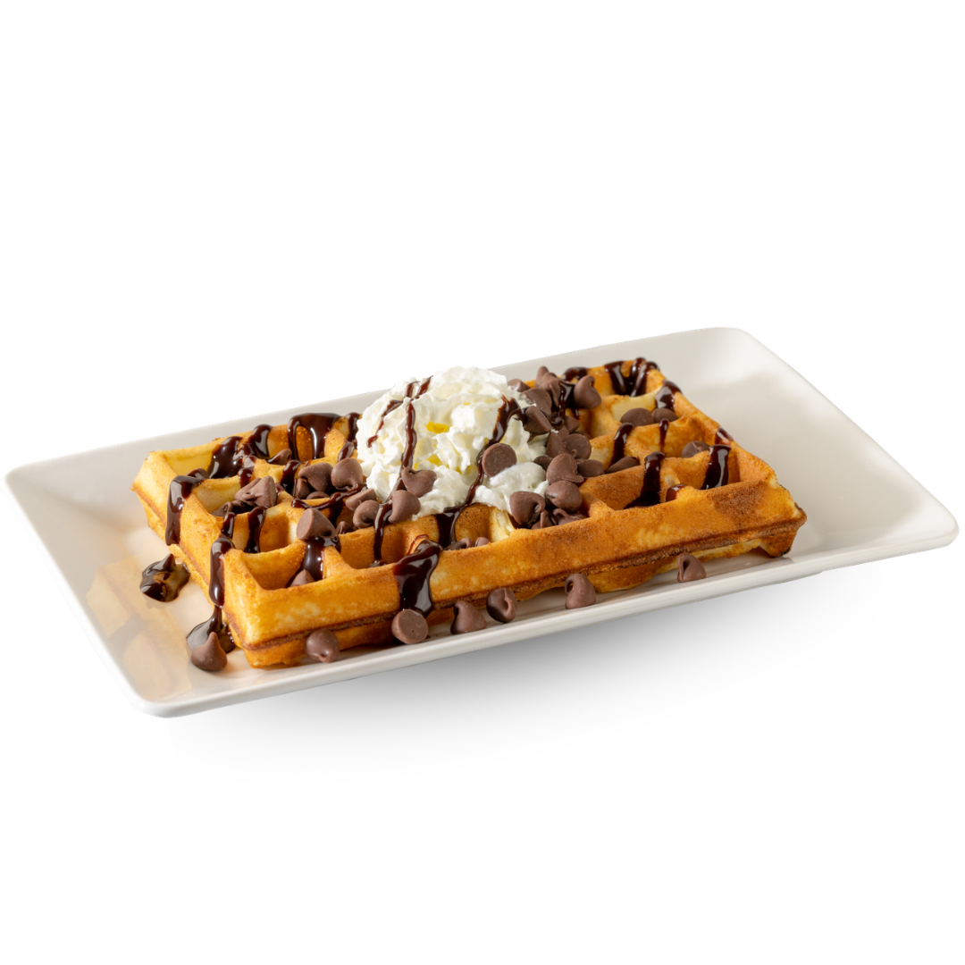 Our original golden-brown waffle loaded with real Hershey’s milk chocolate chips, drizzled with chocolate syrup, topped with whipped cream.