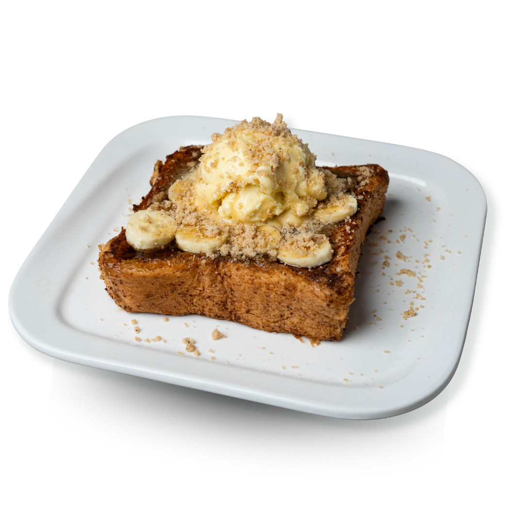 Freshly battered toast bread topped with a maple sauce, vanilla ice-cream, bananas, and a sprinkle of cinnamon crumbles.